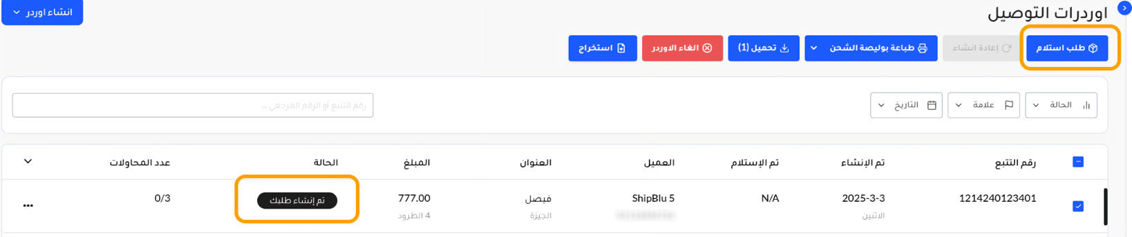 - بعد رفع الاوردر على سيستم شيب بلو، يتم ظهور الاوردرات في خانة "اوردرات التوصيل" وحالة الشحنة بتكون "تم إنشاء طلبك".