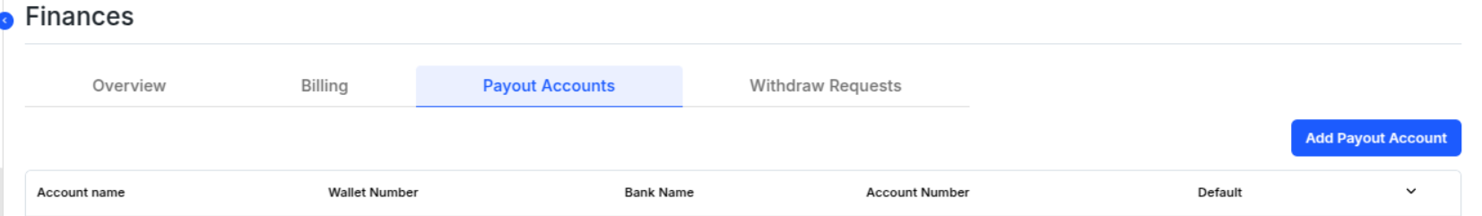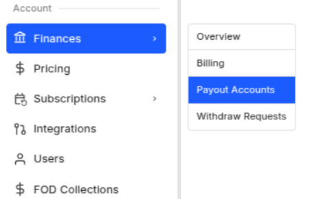 - Below "Account," click on "Finances", then " Payout Accounts".